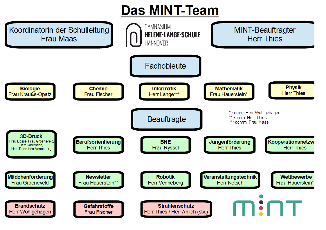 Wenden Sie sich bei Fragen gerne an die zuständigen Ansprechpartner für die unterschiedlichen Bereiche, die Sie dem MINT-Organigramm entnehmen können.