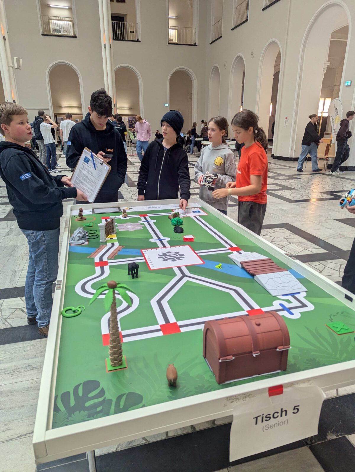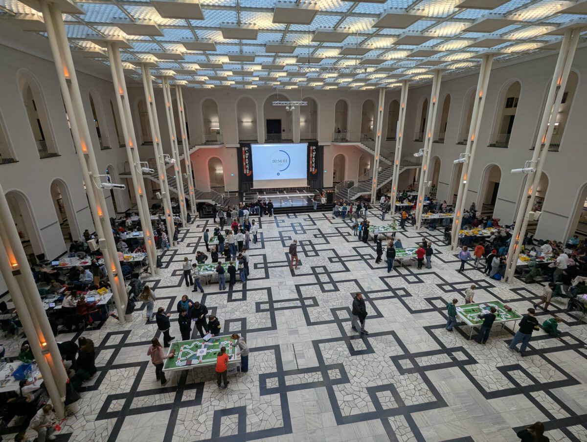 Das Motto der diesjährigen Wettkampfmatte war „Dschungel“ wodurch von einem Affenbaby, das zurück zu seiner Mutter wollte, über eine „Verfolgungsjagd“ mit einem Jaguar, bis hin zu einem Goldschatz, der geborgen werden musste, viele kreative, abwechslungsreiche und herausfordernde Aufgaben im Parcours auf die Roboter der Teams warteten. Diese Aufgaben mussten in drei gewerteten Läufen absolviert werden, zwischen denen im Lichthof der Leibniz Universität Hannover fleißig an der Optimierung der Roboter und ihrer Programmierung gefeilt wurde.
