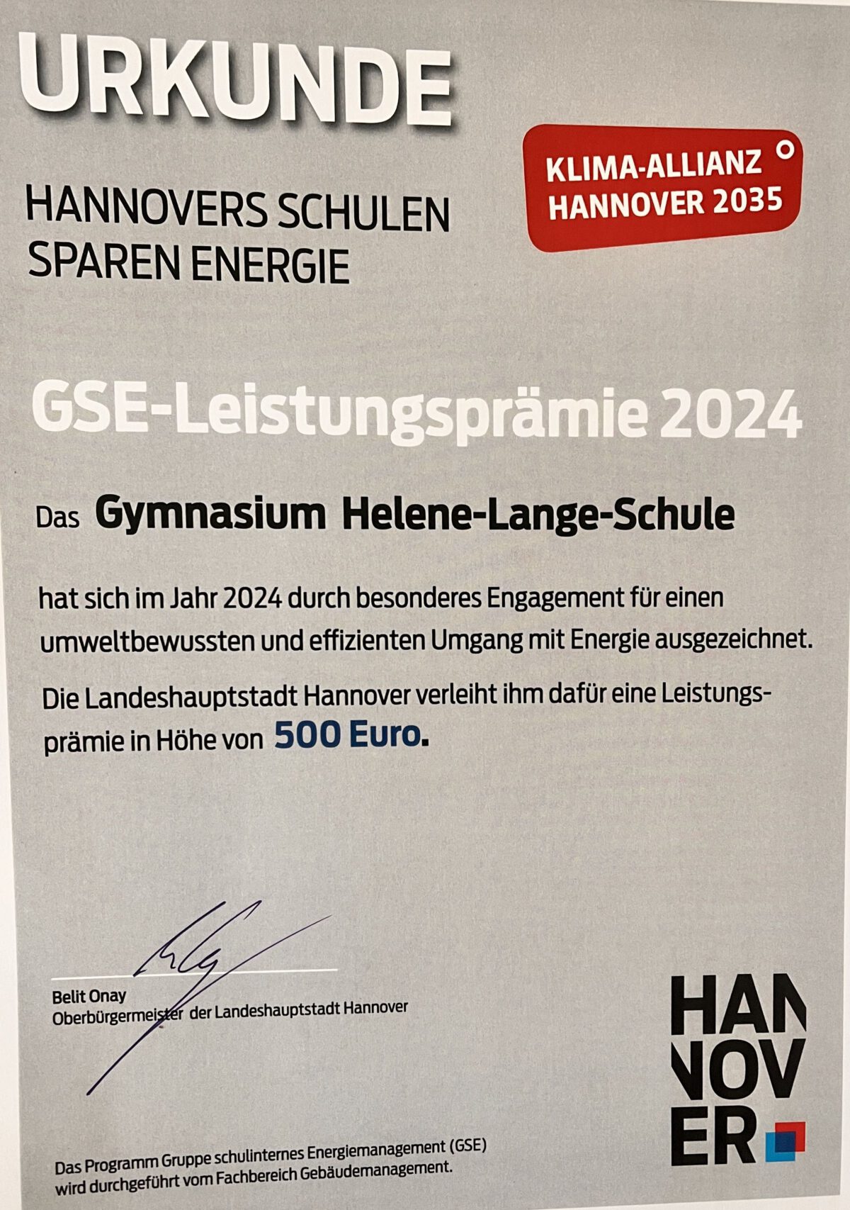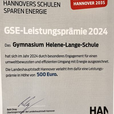 Für die Bemühungen unserer Schule um Energieeinsparungen und Klimaschutz ist die HLS von der Stadt Hannover mit einem Preisgeld prämiert worden.