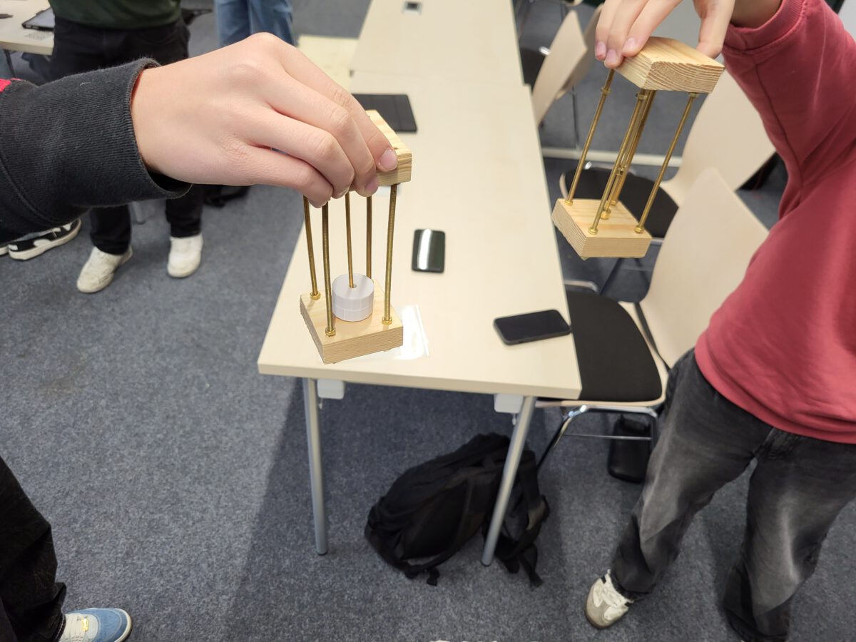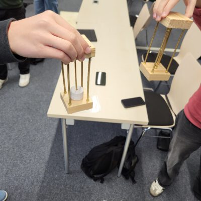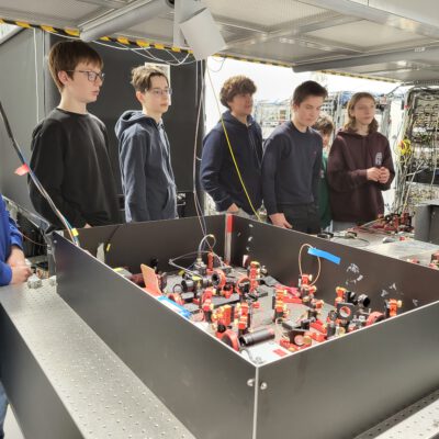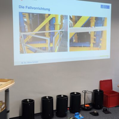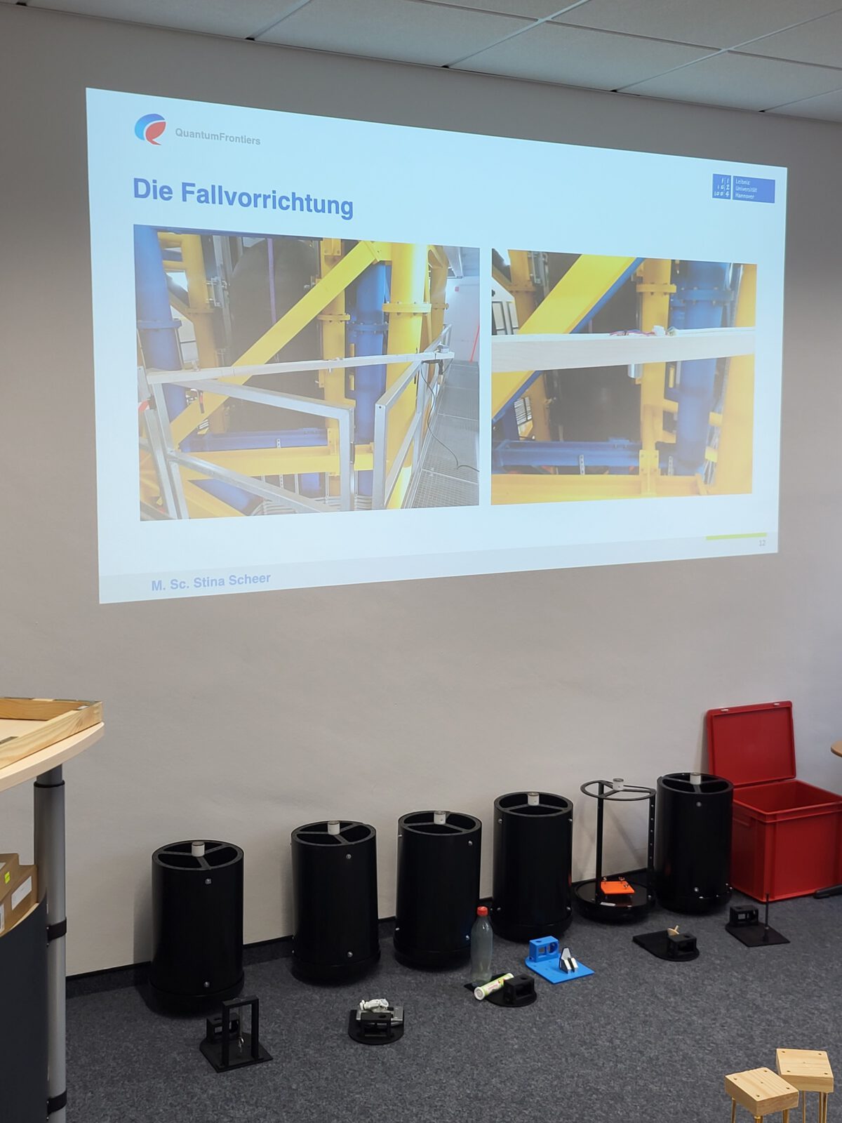Es warteten viele spannende Experimente zur Kraft, Beschleunigung und Fallbewegung auf die Schülerinnen und Schüler. Nach einigen Demonstrationen und einem vielfältigen Stationenlernen zur Mikrogravitation bereiteten die Gruppen anschließend eine eigene Fallkapsel samt integriertem Experiment und Kamera vor. Nach der Mittagspause ging es dann direkt in den sog. „Einstein Elevator“. In dem 40 m hohen Experimentierturm ließen die Schülerinnen und Schüler den eigenen Versuch aus 12 m Höhe fallen und werteten die „Daten aus der Schwerelosigkeit“ im Anschluss aus. Auch eine Führung durch das Uhrenlabor im Institut war im Anschluss noch möglich.